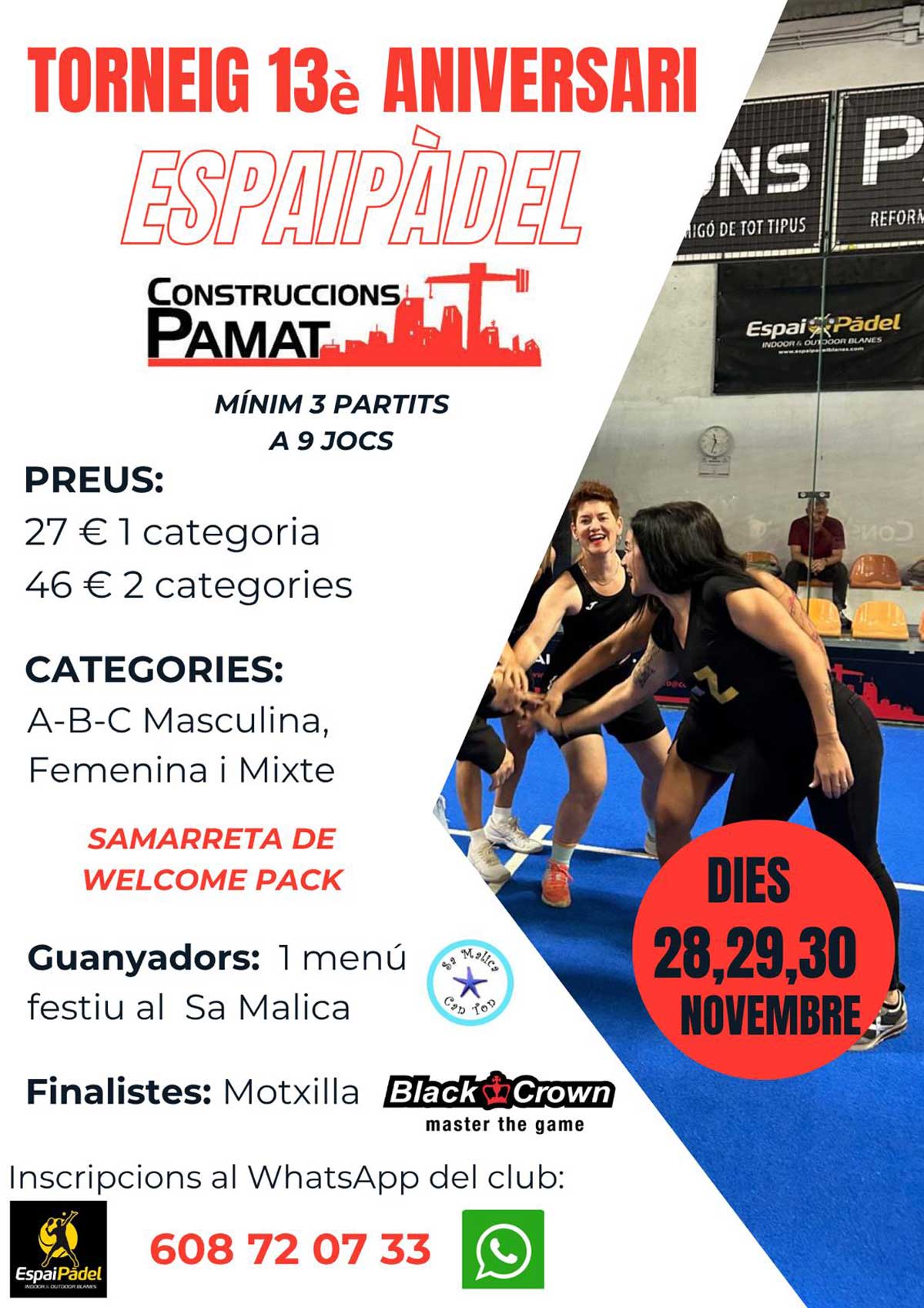 Troba companys i reserva la teva pista amb Playtomic, o utilitza el telèfon o WhatsApp.